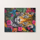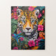 Portrait de fond d'un jaguar aux yeux bleus percés, encadré par un feuillage tropical vif. La fourrure du jaguar est un mélange frappant de jaune, noir et blanc, créant un contraste audacieux avec les feuilles verdoyants et les fleurs roses vives. L'image capture le regard intense de l'animal, suggérant un sentiment de puissance et de mystère.