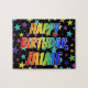 Cette conception de puzzle passionnante, amusante, sur le thème de l'anniversaire a le message "HAPPY BANTHDAY, JAIME" avec les personnages ayant un spectre arc-en-ciel coloré inspiré motif dégradé, ainsi qu'un motif arrière - plan étoiles vibrant. Un puzzle aussi excitant pourrait être utilisé pour envoyer un message d'anniversaire à quelqu'un nommé Jaime. [~Z0000468]