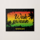 Wah Gwaan Jamaïcain bonjour puzzle avec des palmiers en silhouette noire sur un coucher de soleil rasta coloré