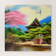 This puzzle features a scene with a Japanese woman sitting in her garden surrounded by trees and with a house, crane and mountains in the background.