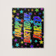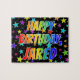 Ce puzzle animé, dynamique et sur le thème de l'anniversaire présente le message "HAPPY BANTHDAY, JARED" avec des personnages ayant un motif dégradé coloré inspiré du spectre arc-en-ciel, ainsi qu'une étoile excitante forme un motif arrière - plan. Un puzzle aussi éclatant pourrait être une façon amusante d'envoyer des salutations d'anniversaire à quelqu'un nommé Jared. [~Z0000468]