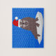 Ce puzzle impressionnant présente une image graphique d'un joli petit morse de Noël. Le Walrus a une fourrure brune avec de grands yeux noirs et des défenses blanches. Il est assis sur un iceberg au milieu de l'océan et porte un casquette festif rouge et blanc. Le morse est entouré de jolis flocons bleus octogonaux qui tombent tout autour.