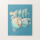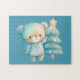 Un puzzle avec une adorable illustration. Un ours douillet aux étoiles et aux étincelles dans sa fourrure. À côté d'un sapin de Noël. Couleur pastel bleu-vert. Whimsical et mignon.