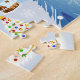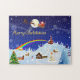 De belles neiges avec des arbres de Noël, des maisons, un bonhomme de neige, une église, et un arc-en-ciel avec neige tombante et flocons de neige. Un Père Noël unique survolant une pleine lune le soir de Noël.