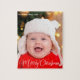 Elégant puzzle photo Joyeux Noël avec belle écriture cursive en blanc. Ce cadeau photo bébé de vacances moderne présente une magnifique typographie et votre texte personnalisé sur l'image de fond en blanc en haut. Parfait pour célébrer un bébé souriant ou un enfant heureux.