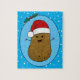 Adorable pomme de terre de dessin animé marrante, mignonne et heureuse portant un chapeau de Père Noël rouge et blanc. La pomme de terre est dans un style d'art de dessin animé et colorée en marron, elle a des bras et des doigts en bâtonnets et un grand sourire heureux avec des points pour les yeux. Le chapeau de Père Noël sur sa tête est rouge avec une garniture blanche et un pompon blanc qui pend. Il est à l'intérieur d'une forme ovale bleu clair avec un cadre bleu foncé et deux feuilles de houx vertes avec deux baies rouges en haut de l'ovale. La couleur de fond est un bleu clair vif avec des flocons de neige blancs flottant autour pour donner une atmosphère festive à ces mignons puzzles saisonniers.