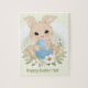 Mignonne lapin de Pâques avec un puzzle d'oeuf bleu. Personnalisez facilement le texte. - Kate Eden Art.
