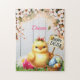 Joli bébé poussin vous souhaitant Joyeux Pâques avec des oeufs colorés dans un panier. vous pouvez aussi personnaliser avec un nom de filles