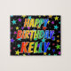 Ce puzzle dynamique, animé, sur le thème de l'anniversaire, présente le message "HAPPY BANTHDAY, KELLY" avec les personnages ayant un motif dégradé coloré inspiré du spectre arc-en-ciel, en plus d'un champ amusant d'étoiles arrière - plan motif. Un puzzle coloré comme celui-ci pourrait être une façon amusante d'envoyer des voeux d'anniversaire à quelqu'un nommé Kelly. [~Z0000468]