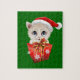 Cute Kitten Père Noël avec de grands yeux bleus tenant un grand cadeau de Noël rouge