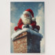 L'image montre le Père Noël assis au sommet d'une cheminée en brique recouverte de neige, habillé de son emblématique costume rouge avec garniture en fourrure blanche et un casquette rouge. Il sourit chaleureusement, ses mains gaillées se serrent les mains, tandis que la neige tombe doucement autour de lui. L'arrière - plan dispose d'un ciel doux et hivernal avec des nuages clairs, ce qui renforce l'atmosphère festive et magique de la scène.