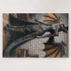 Ce puzzle unique présente un design industriel victorien steampunk de l'équipement d'équitation pour un pilote de dragon steampunk à vie en cuir noir et des ailes de dragon pour un monde imaginaire de guerriers, steampunk, dragons et mythologie.