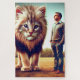 This fantasy puzzle has a large kitten and a man pictured on it.