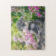 Puzzle Le chiot Schnauzer dans un jardin fleuri