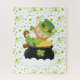 La conception douce et de fête, des configurations mignonnes d'un lutin de bande dessinée était perché sur un pot d'or noir sur un fond des shamrocks colorés multi.