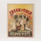 Publicité vintage d'une scène au pôle Nord où les ours polaires dégustent des tasses de bière brune, avec un effet trompe-l'oeil montrant des gens surchauffés, des ventilateurs et des parasols, et un homme qui arrive sur la scène pour une tasse fraîche et froide gelée de bière brune offerte par un ours polaire.
