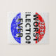 Les pires candidats. Cercle en rouge, bleu et blanc, texte en noir avec contours blancs. Effet désordonné appliqué au design.