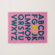 Design de typographie amusant et ludique de l'Alphabet en rose Fuchsia brillante et bleu Turquoise avec le H et l'I en jaune citron