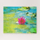 Un nénuphar fuchsia avec feuillage vert citron dans une eau turquoise fait un puzzle d'inspiration Monet.