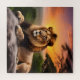 Beau Lion posé sur un rocher avec coucher de soleil de jungle derrière