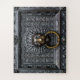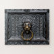 Un magnifique lion de porte-porte en laiton sur une antique porte en acier forgé.