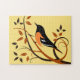 Art décoratif d'oiseau sur puzzles de l'oriole de Baltimore perché sur des volutes de branches stylisées avec un motif de feuilles en deux tons de couleur