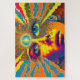 Ce puzzle d'art psychédélique coloré présente le visage d'une femme en gros plan avec des rayons de lumière qui jaillissent d'un cercle brillant sur son front. Il ferait un beau cadeau pour un passionné de scie.