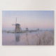 Casse-tête d'un paysage d'hiver avec de vieux moulins à vent dans la lumière en pastel molle d'un lever de soleil avec de la glace sur la rivière et le gel sur les roseaux un matin froid dans Kinderdyke, Pays-Bas.