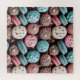 Puzzle mignon pour les fans de macaron. Joli macaron blanc, bleu, rose et chocolat avec des arômes.