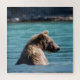 The bear's expression is one of quiet focus and stoicism. With its ears perked and its gaze fixed on something downstream, it exemplifies the raw, untamed spirit of the Pacific Northwest. The vibrant, teal-blue water creates a stunning contrast against the earthy tones of the bear’s fur, while the soft-focus background of rocky shoreline emphasizes the solitude and scale of the Alaskan wilderness.