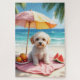 Un Maltipoo duveteux profitant d'un cadre de plage calme avec des fruits frais et des vues océaniques douces. Le style pictural crée une ambiance côtière légère et joyeuse.