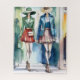 Puzzle. Deux mannequins habillés à la mode, en casquette, et des mini-jupes, marchent en toute confiance devant un arrière - plan coloré.