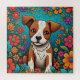 Adorable art de l'air blanc avec un chien chiot brun et blanc entouré de fleurs d'art populaire en rose, orange et violet.