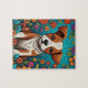 Adorable art de l'air blanc avec un chien chiot brun et blanc entouré de fleurs d'art populaire en rose, orange et violet.