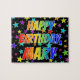Ce design de puzzle animé et amusant sur le thème de l'anniversaire a le message "HAPPY BANTHDAY, MARY" avec les personnages ayant un spectre arc-en-ciel coloré inspiré de dégradé motif, ainsi qu'une étoile excitante formes arrière - plan motif. Un puzzle aussi excitant pourrait être une façon amusante d'envoyer un message d'anniversaire à quelqu'un appelé Mary. [~Z0000468]