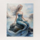 Jigsaw puzzle d'une sirène sereine avec des cheveux longs qui coule gracieusement sur un rocher entouré d'eaux océaniques calmes et de falaises lointaines. Des couleurs douces et pastel rehaussent l'atmosphère paisible et magique de la scène.