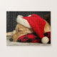 Ce puzzle est illustré d'une photo d'un mignon chien de repérage d'or qui porte un chapeau de Père Noël et qui dort sur un coussin de plaid rouge.
