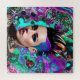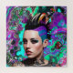 Rocker punk mohawk femme avec mohawk coloré, tatouages et piercings et abstrait art fluide arrière - plan en noir, violet, vert et bleu.
