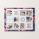 Envoyez un beau cadeau personnalisé à votre mère (MOM) qu'elle chérira pour toujours. Puzzle de collage de photos de famille personnalisée pour afficher vos propres photos de famille et souvenirs spéciaux. Notre design comprend un simple 7 montage photo avec des lettres "MOM" affichées dans la grille. Chaque photo est encadrée d'une simple bordure dorée. Une belle floraison rose et violet encadre le puzzle. Customisez avec les noms de famille. (note : la couleur de la lettre "MOM" peut être modifiée selon votre préférence) L'illustration florale est une oeuvre d'art originale dessinée à la main par Moodthology.