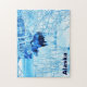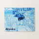 Image bleue et blanche d'un orignal de vache en milieu urbain en hiver. Le texte "Alaska" apparaît également. Les orignaux sont des résidents de nombreuses collectivités de l'Alaska qui vivent toute l'année. Ici à Anchorage il y a environ 1500 animaux, ainsi que des loups, des ours bruns et d'autres animaux sauvages.Ils sont généralement bien élevés. Ils traversent souvent les rues aux passages piétons après avoir attendu un signal de marche. D'une photo d'une orignale qui a traversé ma cour.