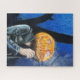 Un puzzle d'Halloween éffrayant avec l'oeuvre pastel "The Headless Biker". Cette illustration montre un fantôme à la tête de citrouille portant une veste en cuir fumant une cigarette sur une nuit froide et sombre d'octobre. OEuvre originale : Pastels sur papier. Copyright Dominic A. White. Tous droits réservés.