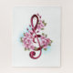 Pink treble clef with delicate, detailed pink Japanese cherry blossoms against white background painted over with light blue paint Blooming pink sakura.
