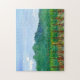 Un joli puzzle décoré d'une aquarelle représentant un vignoble de Napa Valley en Californie au printemps avec des roses fleurissant au bout de chaque rangée de vignes avec des montagnes verdoyantes et un ciel bleu clair.