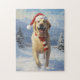 Design coloré d'un Labrador heureux portant un chapeau de santa traversant les montagnes enneigées et souhaite un joyeux noël.