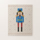 Un puzzle de Noël avec l'illustration d'un Casse-Noisette, quelques étoiles et des points rouges ornements sur un arrière - plan brun rayé. Un beau cadeau pour un cadeau à Noël !