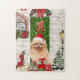 Chien de Poméranie Noël assis à l'extérieur de la maison décorée avec la couronne de Noël, le sapin de Noël est une idée cadeau de Noël parfait pour les amoureux de les chiens.