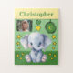 Puzzle de 30 pièces pour enfants. Avec un éléphant mignon, avec des étoiles et des coeurs d'amour. Ajoutez un nom, une initiale et une photo. Modèle de couleurs : vert et jaune Idée cadeau pour enfants.