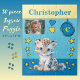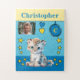 Puzzle de 30 pièces pour enfants. Doté d'un mignon léopard, d'étoiles et de coeurs d'amour. Ajoutez un nom, une initiale et une photo. Plan de couleurs : bleu et jaune Idée cadeau pour enfants.