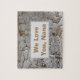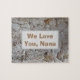 "We Love You Nana" est le sentiment sur ce puzzle personnalisé. L'arrière - plan présente une photo d'écorce d'arbre qui affiche un motif abstrait. L'arrière - plan gris clair du tronc de l'arbre est pointillé et tourbillonné de points brun doré et rouge, ainsi que de lignes courbes en gris foncé. Le centre de ce puzzle rustique est un rectangle gris clair qui fournit la couleur arrière - plan solide pour "We Love You, Nana" qui peut facilement être customisé pour répondre à vos besoins.