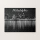 C'est le bel horizon de la ville de Philadelphie, prise la nuit de l'autre côté du fleuve Delaware au bord de mer de Camden. L'architecture des gratte-ciel et les bâtiments de Philly sont sur l'affichage en cette photo noire et blanche. La ville centrale, le centre-ville de Philadelphie, est le centre de cette photographie. Les lumières de la ville ont moulé des réflexions sur l'eau.